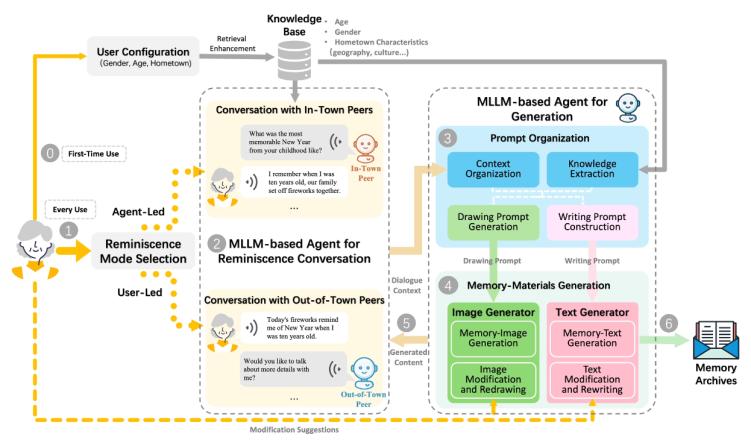 大語言模型(LLMs),尤其是多模態(tài)大模型(MLLMs)的發(fā)展,為解決上述問題提供了新的可能性。我們的研究不僅僅是利用LLMs的交互能力和內(nèi)容生成能力,而是專注于定制化MLLMs,以更好地滿足“老漂族”的特定回憶需求。通過調(diào)整 MLLMs,使其在缺乏實(shí)體回憶材料的情況下仍能生成真實(shí)而個(gè)性化的回憶內(nèi)容,包括回憶對(duì)話、圖像和文本,使其能夠與“老漂族”的生活經(jīng)歷產(chǎn)生共鳴,從而打造更具沉浸感的回憶體驗(yàn)。