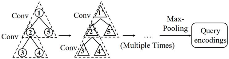 首先,query encoder以查詢計(jì)劃為輸入,使用Tree-CNN模型[4]進(jìn)行編碼,輸出單個(gè)查詢的編碼向量。Tree-CNN的正向計(jì)算過程如圖2所示,其主要優(yōu)勢(shì)在于,在保留樹結(jié)構(gòu)信息的同時(shí),不會(huì)受到樹深的過度影響。