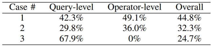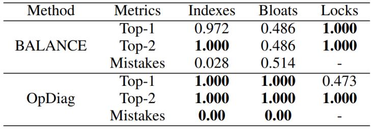 查詢級(jí)診斷結(jié)果如表1所示。OpDiag能在Top-2查詢中準(zhǔn)確檢出所有案例,比現(xiàn)有工作BALANCE [3]的準(zhǔn)確率更高。表中之所以有較多的100%,是因?yàn)槲覀儚?fù)現(xiàn)異常時(shí)注入的查詢相對(duì)于背景負(fù)載較為突出,更容易被定位到。
