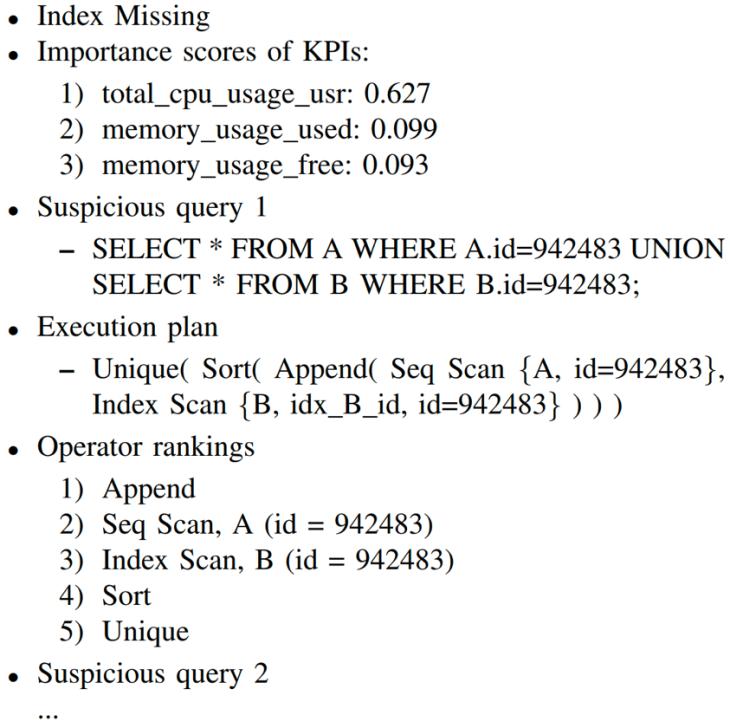 最后,綜合各步驟的結(jié)果,輸出完整的診斷報(bào)告,其中包含異常類型、異常性能指標(biāo)、可疑查詢、可疑算子信息,可為異常修復(fù)提供直接指導(dǎo)。