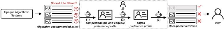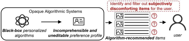 在本文中,我們旨在設(shè)計(jì)一款幫助用戶過濾不適推薦內(nèi)容的工具。這一任務(wù)面臨兩個(gè)關(guān)鍵挑戰(zhàn):(1) 用戶對不適內(nèi)容的感知高度主觀;(2) 推薦此類內(nèi)容的算法通常是黑箱系統(tǒng)。如圖 1 所示,我們將問題形式化如下:黑箱個(gè)性化算法根據(jù)推測的用戶偏好畫像(通常隱含在嵌入表示中)向用戶推薦內(nèi)容,我們的目標(biāo)是識別并過濾用戶主觀認(rèn)為不適的內(nèi)容。由于算法系統(tǒng)的不透明性,用戶的偏好畫像既難以理解也無法編輯,使用戶難以影響算法的決策。