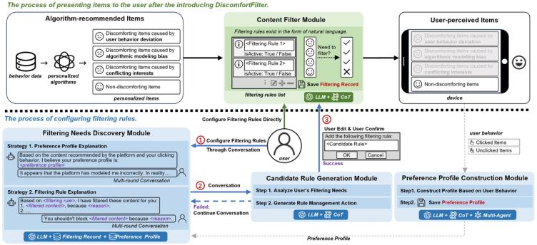 個(gè)性化算法可能會無意中將用戶暴露于令人不適的推薦內(nèi)容中,從而可能引發(fā)負(fù)面后果。不適感的主觀性及算法的黑箱特性使得有效識別和過濾此類內(nèi)容頗具挑戰(zhàn)。為解決這一問題,我們首先開展了一項(xiàng)形成性研究,以了解用戶在過濾不適推薦內(nèi)容方面的實(shí)踐與期望。隨后,我們設(shè)計(jì)了一款基于大語言模型的工具 DiscomfortFilter。該工具可為用戶構(gòu)建可編輯的偏好畫像,并通過對話幫助用戶表達(dá)過濾需求,從而在畫像中屏蔽不適的偏好?;诰庉嫼蟮?/span>畫像,DiscomfortFilter以即插即用的方式實(shí)現(xiàn)不適推薦過濾,同時(shí)保持靈活性與透明度。構(gòu)建的偏好畫像能提升大語言模型的推理能力并簡化用戶對齊,使一個(gè)38 億參數(shù)的開源大語言模型在離線代理任務(wù)中可與頂尖商業(yè)模型媲美。為期一周、包含 24 名參與者的用戶研究驗(yàn)證了DiscomfortFilter的有效性,同時(shí)表明該工具通過調(diào)控內(nèi)容暴露,有效減少了平臺推薦結(jié)果中的不適內(nèi)容。最后,我們討論了當(dāng)前面臨的挑戰(zhàn),強(qiáng)調(diào)其與更廣泛研究領(lǐng)域的關(guān)聯(lián)性,評估對各利益相關(guān)方的影響,并展望未來的研究方向。