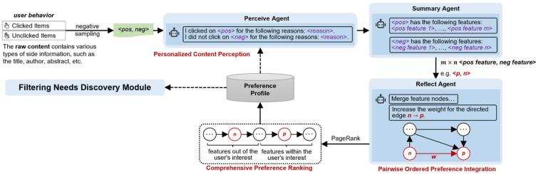 各模塊具體的細(xì)節(jié)請參考原文,這里,我們僅介紹偏好畫像構(gòu)建模塊。該模塊通過分析用戶按時(shí)間順序?qū)ν扑]內(nèi)容的點(diǎn)擊行為來構(gòu)建用戶偏好畫像。該過程與傳統(tǒng)的個(gè)性化算法研究有三個(gè)關(guān)鍵區(qū)別:(1) 它僅基于單個(gè)用戶的行為建模偏好,而不是所有用戶的行為;(2) 它通過捕捉用戶點(diǎn)擊的內(nèi)容以及用戶選擇忽略的推薦項(xiàng),提供更全面的隱式反饋;(3) 它必須實(shí)時(shí)執(zhí)行,能夠即時(shí)響應(yīng)用戶的點(diǎn)擊。該過程的關(guān)鍵在于,將用戶對推薦內(nèi)容的點(diǎn)擊行為總結(jié)為由特征組成的偏好畫像,并在一段時(shí)間內(nèi)保持該畫像的更新。如圖 5 所示,我們提出了一種基于 LLM 的多智能體流水線來完成這一過程。我們采用了成對排序?qū)W習(xí)(pairwise rank learning)的一般假設(shè)——當(dāng)兩個(gè)內(nèi)容同時(shí)展示時(shí),被點(diǎn)擊的內(nèi)容對用戶更具吸引力。對于每個(gè)被點(diǎn)擊的內(nèi)容(記為 pos,表示正樣本),該模塊會隨機(jī)抽取一個(gè)同時(shí)出現(xiàn)但未被點(diǎn)擊的內(nèi)容作為負(fù)樣本(記為 neg),然后構(gòu)造一個(gè)有序?qū)?。需要注意的是,pos 和 neg 均為未經(jīng)處理的原始內(nèi)容。隨后,該有序?qū)M(jìn)入流水線進(jìn)行處理。