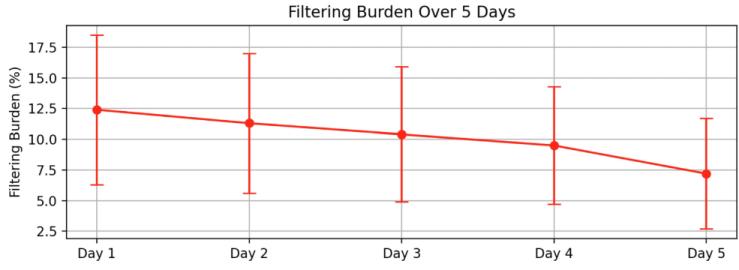 此外,我們還在知乎上開展了一項(xiàng)為期一周的用戶研究,共有 24 名參與者。研究結(jié)果表明,我們的設(shè)計(jì)目標(biāo)能夠有效幫助用戶表達(dá)過濾需求,并成功過濾不適推薦內(nèi)容,而 DiscomfortFilter 在這些方面表現(xiàn)良好。我們進(jìn)一步分析了 DiscomfortFilter 如何通過影響不適內(nèi)容的曝光來改變平臺推薦結(jié)果。假設(shè) DiscomfortFilter 使用過濾規(guī)則處理 N 個(gè)內(nèi)容,其中 n 個(gè)內(nèi)容被識別為令人不適,我們定義 n/N 為該規(guī)則的過濾負(fù)擔(dān)。在為期七天的用戶研究中,我們計(jì)算了所有在五天以上仍然有效的過濾規(guī)則的每日平均過濾負(fù)擔(dān)。從配置這些規(guī)則的當(dāng)天起,日均過濾負(fù)擔(dān)的趨勢如圖 7 所示。隨著時(shí)間的推移,過濾負(fù)擔(dān)穩(wěn)步下降,這表明平臺逐漸減少了推薦令人不適的內(nèi)容。這一下降可以歸因于 DiscomfortFilter 的引入,它減少了用戶接觸令人不適的推薦,從而導(dǎo)致用戶與此類內(nèi)容的互動減少。因此,平臺的推薦系統(tǒng)能夠動態(tài)調(diào)整以適應(yīng)用戶不斷變化的偏好,進(jìn)一步降低推薦令人不適內(nèi)容的可能性。需要強(qiáng)調(diào)的是,從用戶的角度來看,令人不適的推薦會立即消失,因?yàn)樗鼈儽煌耆^濾掉了。
