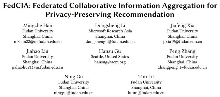 日前,實(shí)驗(yàn)室博士生韓明哲作為第一作者的論文“FedCIA: Federated Collaborative Information Aggregation for Privacy-Preserving Recommendation”被The ACM SIGIR Conference on Research and Development in Information Retrieval (SIGIR) 會(huì)議錄用。