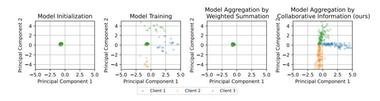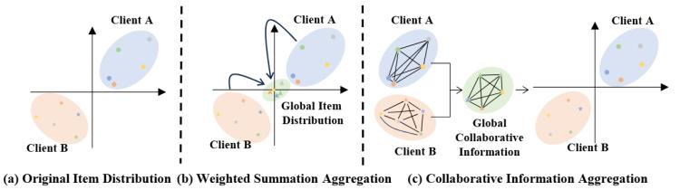 基于這一思想,我們提出一種新的范式:協(xié)同信息聚合范式。如圖1所示,圖1(a)表示了各個(gè)客戶端在聚合前的分布,圖1(b)表示了現(xiàn)有聯(lián)邦學(xué)習(xí)基于參數(shù)的聚合方案,其將參數(shù)強(qiáng)行映射到了一個(gè)空間,因此存在上述問題,而我們提出了全新的范式(圖1(c)),讓物品協(xié)同信息在各個(gè)客戶端保持一致,且不強(qiáng)行更改其分布。