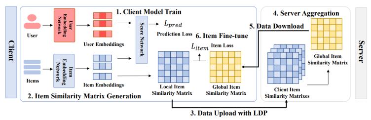 現(xiàn)有的聯(lián)邦推薦系統(tǒng)通常遵循一個(gè)統(tǒng)一的范式。每個(gè)客戶端根據(jù)自身數(shù)據(jù)訓(xùn)練各自的推薦模型,隨后在聚合步驟中將embedding參數(shù)分為用戶和物品兩部分,其中用戶參數(shù)因?yàn)榘擞脩綦[私被客戶端保存在本地,物品參數(shù)則會(huì)被上傳并聚合在中央服務(wù)器上,聚合后的物品參數(shù)被分發(fā)回客戶端,用于下一輪訓(xùn)練。這種方法將不同的用戶模型對(duì)齊到一個(gè)參數(shù)空間中,使客戶端能夠更有效利用全局信息進(jìn)行推薦。