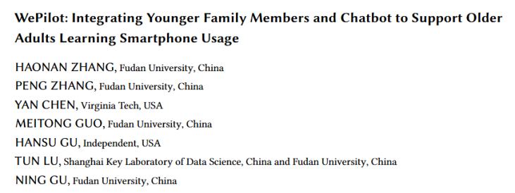 日前,實(shí)驗(yàn)室碩士生張浩男作為第一作者的論文“WePilot: Integrating Younger Family Members and Chatbot to Support Older Adults Learning Smartphone Usage”被CCF A類(lèi)會(huì)議The ACM SIGCHI Conference on Computer-Supported Cooperative Work & Social Computing (CSCW)會(huì)議錄用。該論文是復(fù)旦大學(xué)計(jì)算與智能創(chuàng)新學(xué)院與老齡研究院跨學(xué)科研究團(tuán)隊(duì)AI4SS(AI for Social Science)的最新研究成果。