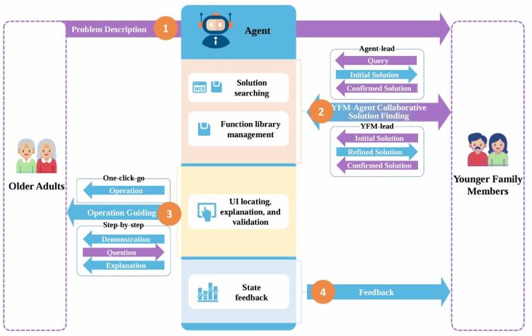 本研究通過(guò)多模態(tài)大模型(MLLMs)與人機(jī)交互和計(jì)算機(jī)支持協(xié)同工作理論,開(kāi)發(fā)了一款面向老年群體與年輕家庭成員的智能手機(jī)使用支持系統(tǒng)——WePilot。論文聚焦于老年人在智能手機(jī)使用中因知識(shí)有限、記憶力下降及信息處理能力減弱所面臨的挑戰(zhàn),并分析了年輕家庭成員在提供技術(shù)支持時(shí)遇到的時(shí)間、知識(shí)和設(shè)備界面差異等問(wèn)題。針對(duì)傳統(tǒng)支持方式(如直接電話(huà)指導(dǎo)或在線(xiàn)教程)在效率和個(gè)性化方面的不足,研究提出了一種基于聊天機(jī)器人調(diào)解的協(xié)作支持機(jī)制。WePilot通過(guò)智能化的解決方案查找模塊、操作引導(dǎo)模塊和反饋模塊,結(jié)合逐步指導(dǎo)和一鍵式操作模式,彌合了老年人與年輕家庭成員在支持時(shí)間、指導(dǎo)粒度和知識(shí)水平上的差距。實(shí)驗(yàn)結(jié)果表明,WePilot顯著降低了雙方的支持負(fù)擔(dān),提升了老年人的操作準(zhǔn)確性和學(xué)習(xí)信心,同時(shí)促進(jìn)了代際情感聯(lián)結(jié)。研究不僅驗(yàn)證了聊天機(jī)器人在遠(yuǎn)程技術(shù)支持中的潛力,也為設(shè)計(jì)智能化、老年友好的技術(shù)支持系統(tǒng)提供了新視角,推動(dòng)了AI在老年學(xué)和人機(jī)交互領(lǐng)域的跨學(xué)科應(yīng)用。