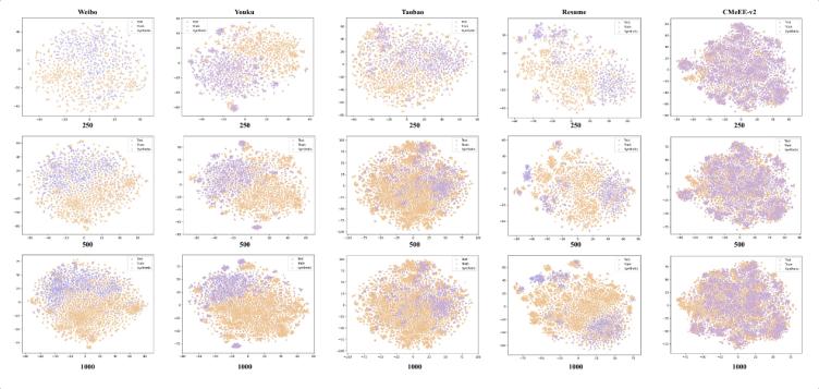 (3) 然而,在Weibo這類數(shù)據(jù)分布特別復(fù)雜的數(shù)據(jù)集上,即便有1000條樣本,語(yǔ)義空間中仍存在未被覆蓋的區(qū)域,因此合成數(shù)據(jù)依然能帶來正面效果。這一發(fā)現(xiàn)深刻揭示了該數(shù)據(jù)增強(qiáng)策略的適用邊界,并直觀地解釋了其在不同數(shù)據(jù)規(guī)模下性能表現(xiàn)差異的原因。