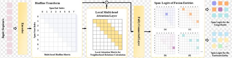 (2)局部多頭注意力機(jī)制: 該模型引入了一個(gè)局部多頭注意力層,用于增強(qiáng)span鄰域特征之間的交互。這使得模型可以在訓(xùn)練階段有效融合目標(biāo)實(shí)體標(biāo)簽和引入的擴(kuò)展標(biāo)簽(如詞性、通用實(shí)體等)信息。