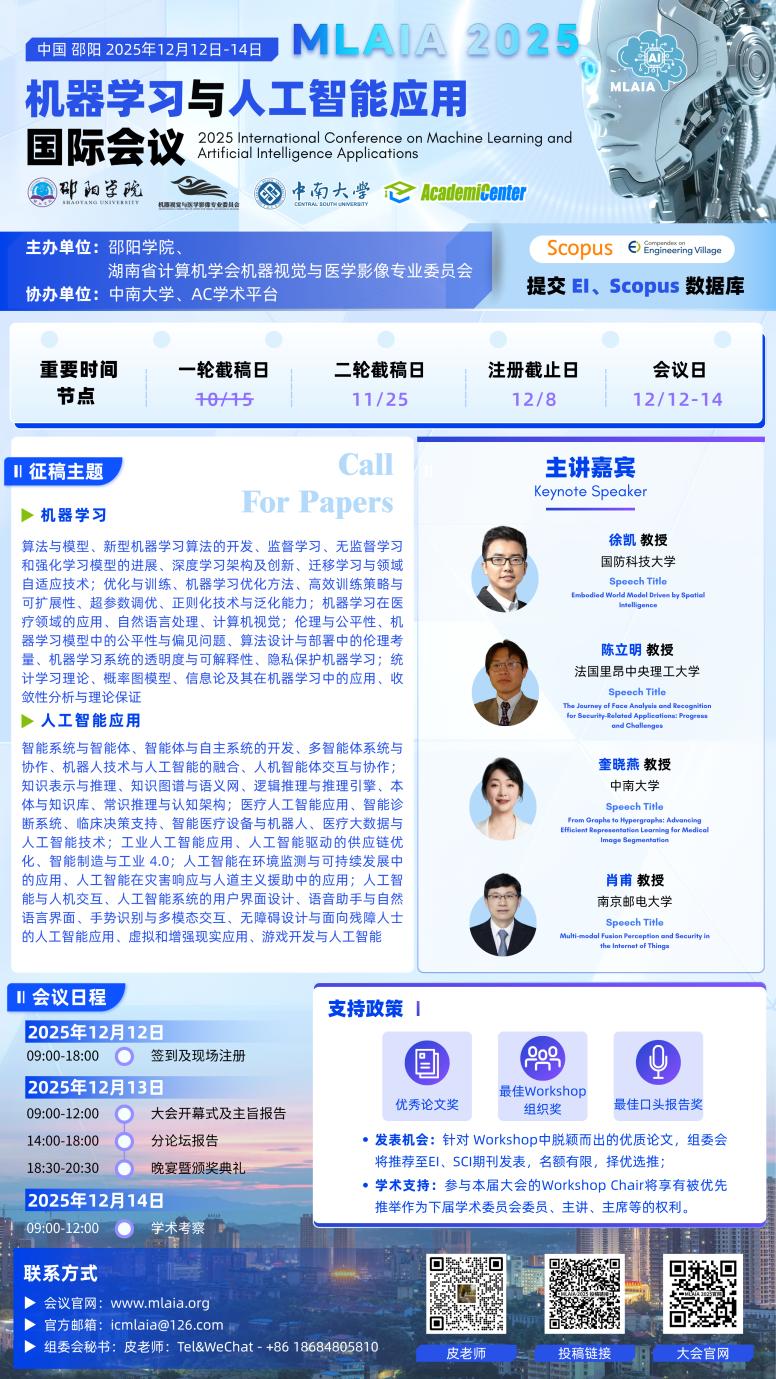 | 2025/12/12-14 | 中國 邵陽 | 機(jī)器學(xué)習(xí)與人工智能應(yīng)用國際學(xué)術(shù)會議 |