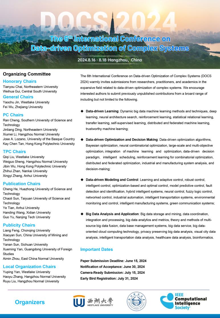 第六屆復雜系統(tǒng)數(shù)據(jù)驅動優(yōu)化國際會議(DOCS 2024)將于2024年8月16-18日在中國杭州召開,組委會誠摯邀請與復雜系統(tǒng)數(shù)據(jù)驅動優(yōu)化相關的廣泛領域的研究人員、從業(yè)人員和學者踴躍投稿、積極參會交流。征稿主題包括但不限于以下內(nèi)容: