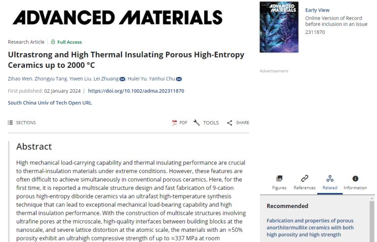 華南理工大學(xué)制備出超高強(qiáng)度、高隔熱的高熵多孔陶瓷材料