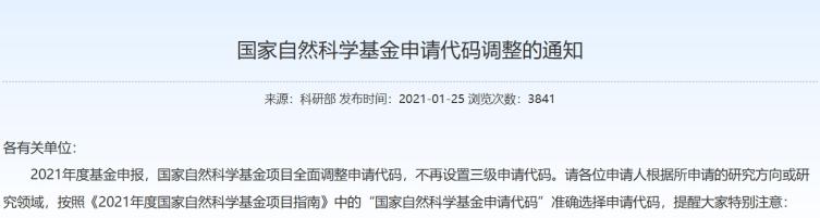 國家自然科學(xué)基金申請代碼調(diào)整的通知