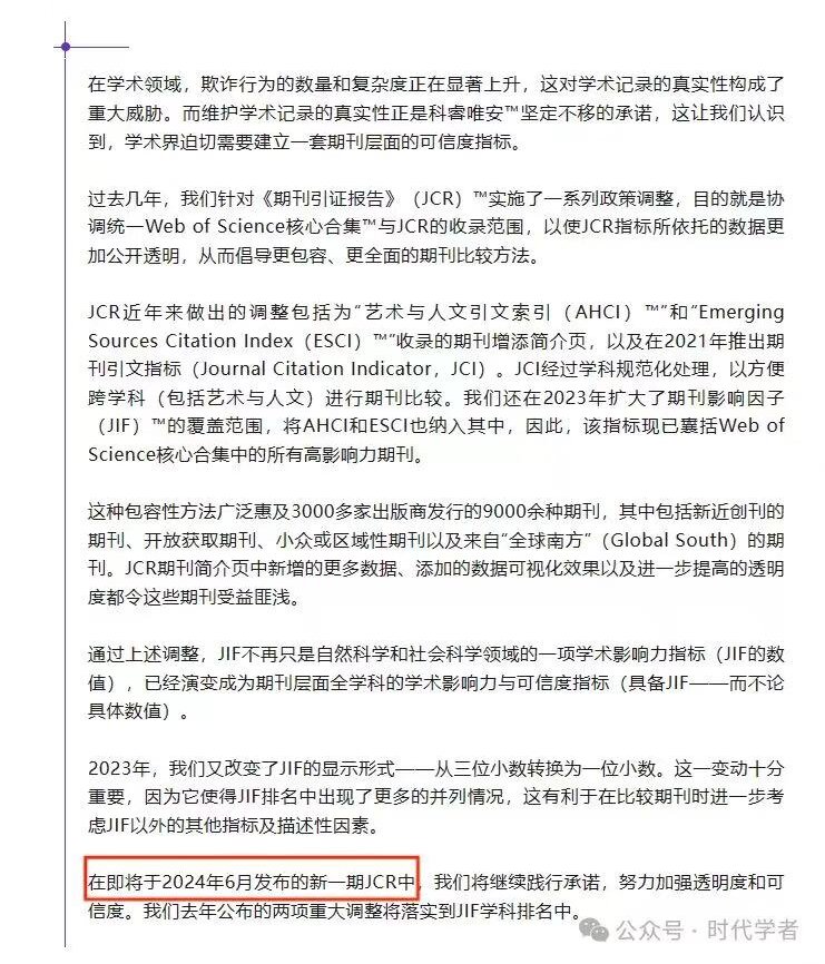 此前,科睿唯安宣布2024年度《期刊引證報告》(Journal Citation Reports,簡稱JCR)將于今年6月發(fā)布。