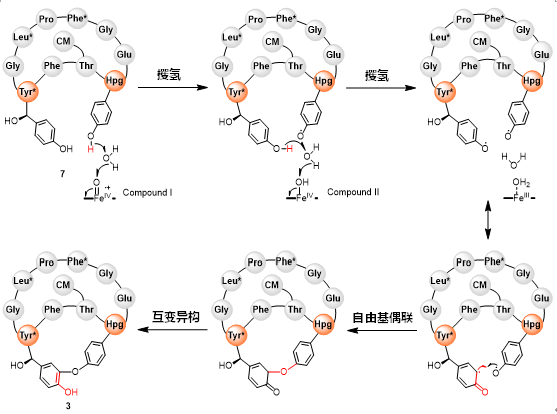 綜上所述,本研究證實了雙環(huán)糖肽類化合物CHM生物合成中3個P450酶的功能,并利用酶學(xué)和計算化學(xué)等方法首次揭示了DmlH催化分子內(nèi)苯酚偶聯(lián)反應(yīng)由水介導(dǎo)的雙自由基機制,為深入理解P450酶催化的分子內(nèi)苯酚偶聯(lián)反應(yīng)提供了新的視角,還為發(fā)現(xiàn)和開發(fā)更多新穎的雙環(huán)肽類化合物奠定了研究基礎(chǔ),有望為抗生素研發(fā)提供更多物質(zhì)基礎(chǔ)。