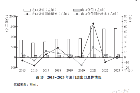 2023年,澳門對(duì)外商品貿(mào)易總額達(dá)到1547.8億澳門元,較2022年的1533.3億元增長(zhǎng)0.9%。全年總出口貨值為133.3億澳門元,同比下降1.3%;再出口117.9億澳門元,同比增長(zhǎng)2.5%;總進(jìn)口貨值為1414.4億澳門元,同比增長(zhǎng)1.2%(見圖15);全年貨物貿(mào)易逆差為1281.1億澳門元,較2022年的1262.9億澳門元增加了18.2億澳門元。