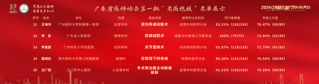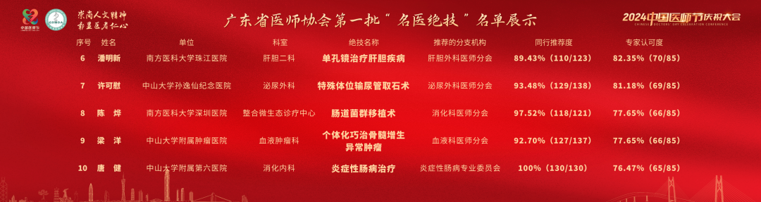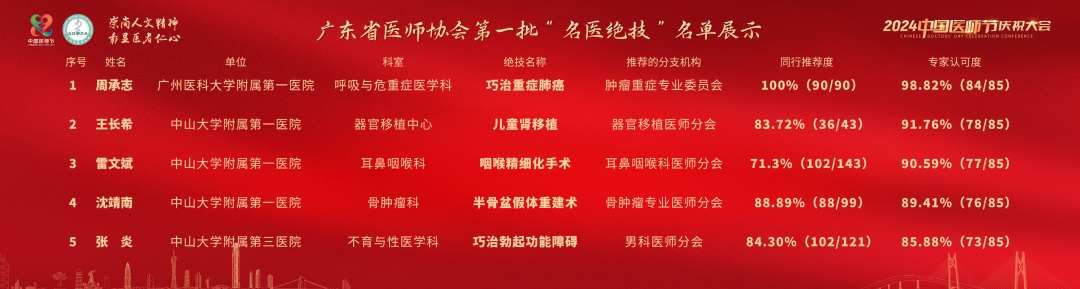 為樹(shù)立廣東醫(yī)師良好形象,展示廣東醫(yī)師的醫(yī)療技術(shù)水平, 激發(fā)廣大醫(yī)師鉆研技術(shù)的積極性,更好滿足人民群眾高水平、高質(zhì)量醫(yī)療服務(wù)需求,廣東省醫(yī)師協(xié)會(huì)開(kāi)展“名醫(yī)絕技”推薦活動(dòng)。經(jīng)個(gè)人自薦、本會(huì)相關(guān)分支機(jī)構(gòu)推薦,同行及專(zhuān)家出具意見(jiàn)等程序,產(chǎn)生第一批“名醫(yī)絕技”名單。名單由廣東省醫(yī)師協(xié)會(huì)副會(huì)長(zhǎng)余敏斌在會(huì)上公布。