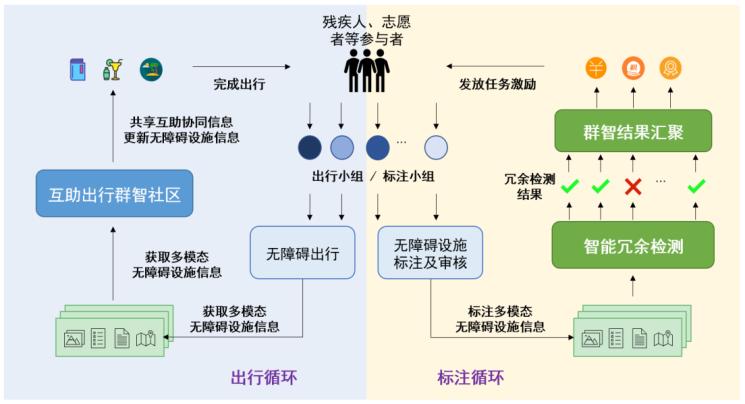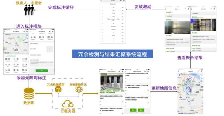 依托國家自然科學基金重點項目《大規(guī)模群智協同計算關鍵理論與技術》,面向城市空間中的殘疾人無障礙出行場景,研發(fā)了“無障礙設施群智協同標注中的冗余檢測與結果推斷系統”,并部署于重點基金應用驗證平臺“殘疾人互助出行群智協同平臺”。該系統以群智協同計算為核心技術,通過標注任務推薦及激勵機制、智能冗余檢測及群智匯聚、互助出行群智社區(qū)等功能模塊,激勵、引導、評估大規(guī)模群智參與者的標注貢獻,實現高質量、高可靠性的無障礙設施信息收集。