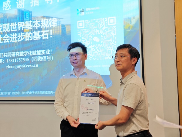 接著,中國(guó)電子技術(shù)標(biāo)準(zhǔn)化研究院高級(jí)工程師張明英以產(chǎn)業(yè)數(shù)字化和數(shù)字產(chǎn)業(yè)化的標(biāo)準(zhǔn)化發(fā)展為題進(jìn)行分享,講述了數(shù)字化時(shí)代數(shù)據(jù)要素標(biāo)準(zhǔn)的構(gòu)建和發(fā)展,深入探討了如何應(yīng)對(duì)行業(yè)轉(zhuǎn)型和升級(jí)面臨的新挑戰(zhàn)。哈爾濱工業(yè)大學(xué)張海軍教授為張博士頒發(fā)感謝狀。