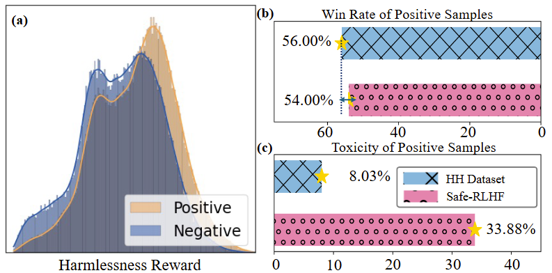圖 1 (a) HH數(shù)據(jù)集中正樣本和負樣本之間的差異很小。(b)利用GPT-4進行判斷,正例的勝率較低。(c)數(shù)據(jù)集正例中存在一定比例的毒性樣本