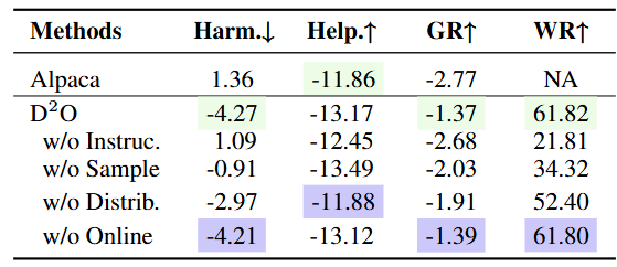 自動化評估的實驗結(jié)果表明,D2O在減少有害性、保持有幫助性、提高訓(xùn)練穩(wěn)定性和加快收斂速度方面均優(yōu)于其他基線方法。此外,我們還進行了人工評估,以評估Alpaca、DPO和D2O生成的響應(yīng)的無害性和有幫助性,結(jié)果進一步驗證了D2O的有效性。在消融實驗中,我們對于D2O的多個變體進行了對比,結(jié)果顯示使用self-correction、分布級別優(yōu)化和在線采樣,有利于性能的提升。