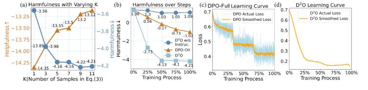 我們進一步探究了訓(xùn)練中采用的正樣本的數(shù)量的影響和以及訓(xùn)練過程中體現(xiàn)的性質(zhì)。在引入更多的合成正樣本時,模型的有害性不斷下降,同時模型的有用性不斷提升,說明引入更多的正樣本能夠減輕對齊稅。同時,我們還可以觀察到,在訓(xùn)練過程中,D2O的有害性下降將對于DPO更快,同時損失函數(shù)的下降更加的平滑,這體現(xiàn)了采用分布級別優(yōu)化的優(yōu)點。