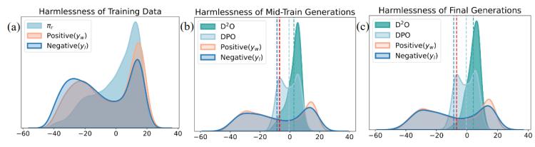 此外,我們還進一步分析了訓(xùn)練的不同階段,模型生成內(nèi)容的獎勵分布變化??梢杂^察到,相比于D2O, DPO對應(yīng)的獎勵分布具有明顯的雙峰特性,說明其在優(yōu)化過程中受到了數(shù)據(jù)中噪聲的影響,而D2O具有明顯的單峰特性,且平均獎勵有著明顯的提升。