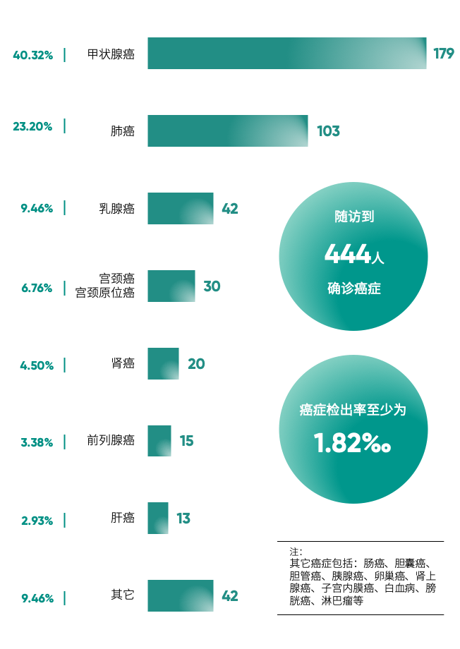 在隨訪到的癌癥患者中,甲狀腺癌確診人數(shù)最多,高達(dá)179人,往下依次是肺癌、乳腺癌、宮頸癌及宮頸原位癌、腎癌等。