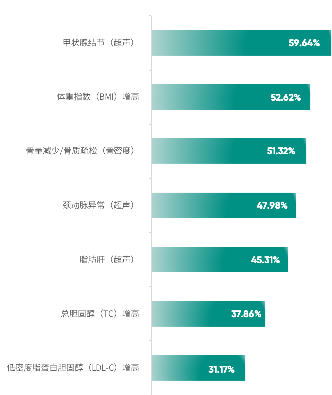 排除與性別相關(guān)的前列腺異常和乳腺結(jié)節(jié),位居TOP1的健康問題是甲狀腺結(jié)節(jié),檢出率達(dá)到59.64%,往下依次為體重指數(shù)(BMI)增高、骨量減少/骨質(zhì)疏松(骨密度)、頸動(dòng)脈異常(超聲)、脂肪肝(超聲)、總膽固醇(TC)增高和低密度脂蛋白膽固醇(LDL-C)增高,檢出率均超過30%。