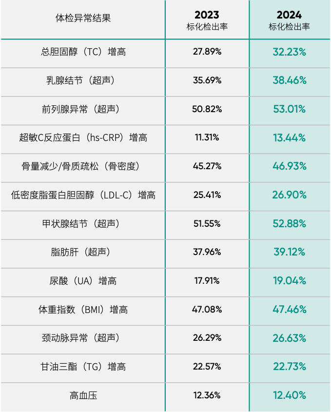 對(duì)比《2024版銀行及保險(xiǎn)高凈值客戶健康綠皮書》和《2023版銀行保險(xiǎn)高凈值客戶健康綠皮書》體檢異常結(jié)果檢出率,2024版有13項(xiàng)體檢異常結(jié)果標(biāo)化檢出率高于2023版,包括總膽固醇(TC)增高、乳腺結(jié)節(jié)(超聲)、前列腺異常(超聲)、超敏C反應(yīng)蛋白(hs-CRP)增高、骨量減少/骨質(zhì)疏松(骨密度)等。在忽略人口結(jié)構(gòu)因素(例如老齡化等因素)的情況下,銀行保險(xiǎn)高凈值客戶的上述體檢異常結(jié)果檢出率增高,需要引起重視。
