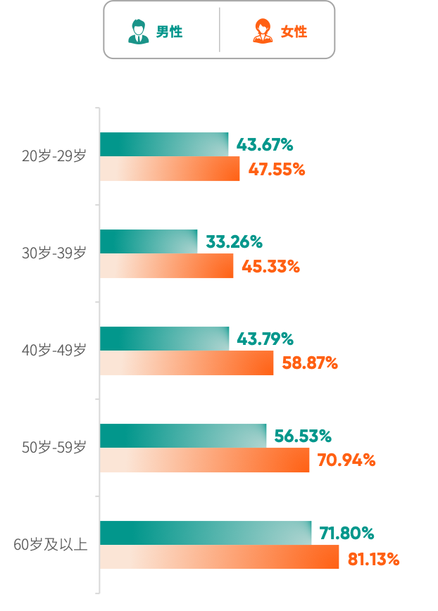 女性銀行及保險(xiǎn)高凈值客戶乳腺健康更是不容樂觀,其中40歲至49歲的檢出率最高,檢出率超過50%,相當(dāng)于2女必有1結(jié)。放眼基于全國(guó)320萬女性體檢人群的《2023年中國(guó)女性健康粉紅報(bào)告》對(duì)比,女性銀行及保險(xiǎn)高凈值客戶的檢出率在各個(gè)年齡段均為高值。