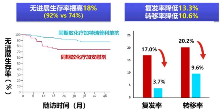 研究結(jié)果顯示,在中位隨訪37.8個月時,與單純同期放化療組相比,特瑞普利單抗聯(lián)合治療組的主要終點2年無進(jìn)展生存率顯著提高(92.0% vs. 74.0%),將疾病進(jìn)展或死亡風(fēng)險降低了60%。在次要終點上,相較于單純同期放化療組,特瑞普利單抗聯(lián)合治療組的3年總體生存率顯著提高(99.0% vs. 90.0%)。此外,3年累積遠(yuǎn)處轉(zhuǎn)移率從20.2%降低到9.6%,3年累積局部區(qū)域復(fù)發(fā)率從17.0%下降到3.7%。在安全性方面,特瑞普利單抗聯(lián)合治療組未發(fā)現(xiàn)新的安全性信號,兩組≥3級治療相關(guān)不良事件發(fā)生率相似(73.7% vs 68.0%)。