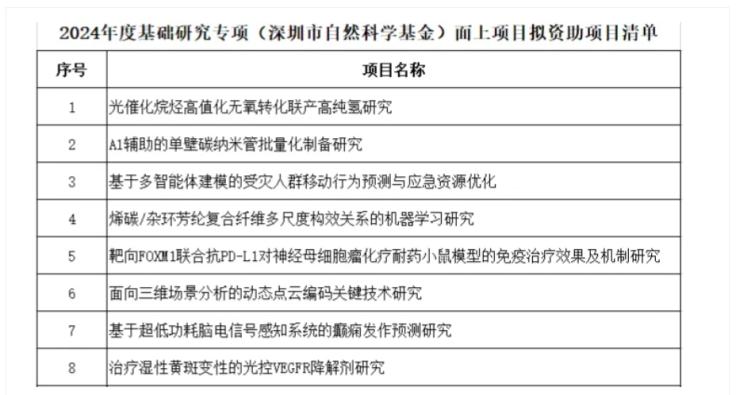 2024年度基礎(chǔ)研究專(zhuān)項(xiàng)(深圳市自然科學(xué)基金)面上項(xiàng)目擬資助項(xiàng)目公示