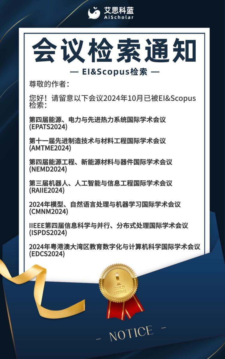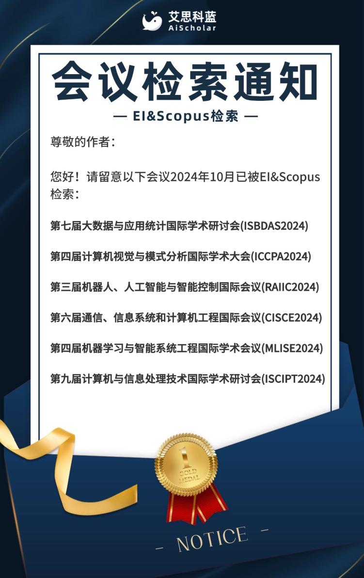 ICOIP 2024、AIPT 2024、PGES 2024、ISCER 2024、ICSIPC 2024、ICECAI 2024 、ICESEP 2024、ISBDAS 2024、 ICCPA 2024、 RAIIC 2024、 CISCE 2024、 MLISE 2024、 ISCIPT 2024、 EPATS 2024、 AMTME 2024、 NEMD 2024、 RAIIE 2024、 CMNM 2024、 ISPDS 2024、 EDCS 2024 均已被EI&Scopus檢索!