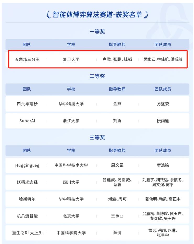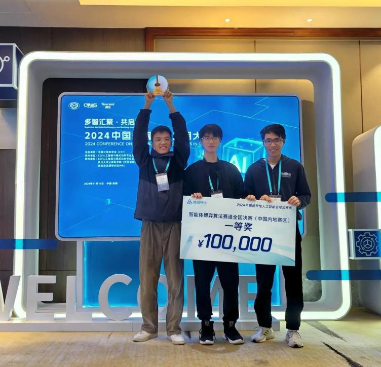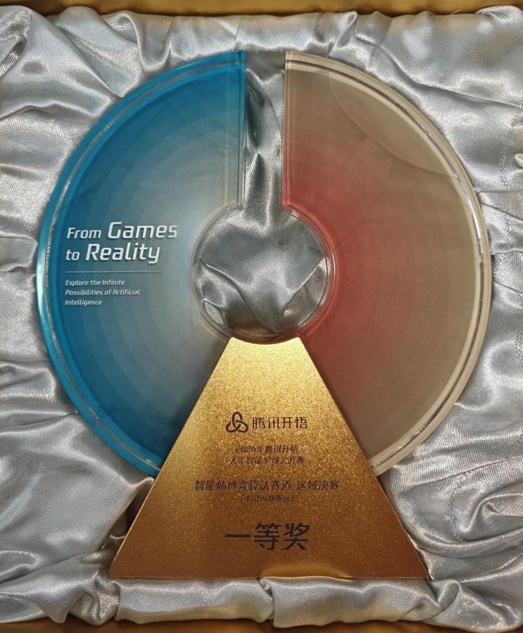 實(shí)驗(yàn)室博士生吳家云,與本科生林佳航和潘成駿組成的“五角場(chǎng)三分王”隊(duì),指導(dǎo)老師為盧暾教授、張鵬副教授和桂韜副研究員,獲得騰訊開悟人工智能全球公開賽“智能體博弈算法賽道”全國(guó)決賽(中國(guó)內(nèi)地賽區(qū))一等獎(jiǎng)!