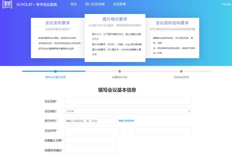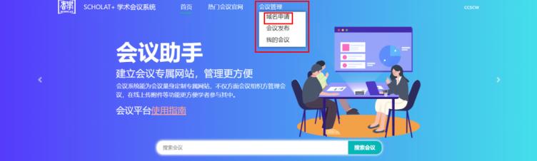 1.登錄賬號(hào)后,進(jìn)入SCHOLAT+學(xué)術(shù)會(huì)議系統(tǒng)首頁,通過點(diǎn)擊【會(huì)議管理】-【會(huì)議發(fā)布】進(jìn)入會(huì)議發(fā)布申請(qǐng)頁。