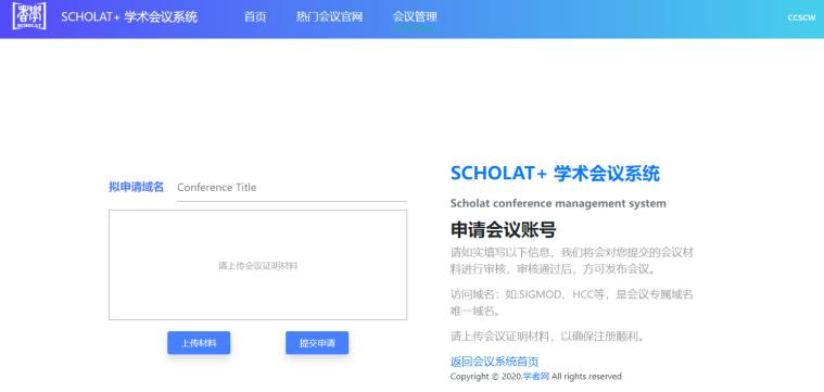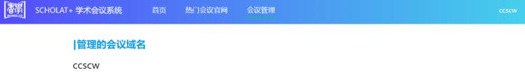 1.登錄賬號(hào)后,進(jìn)入SCHOLAT+學(xué)術(shù)會(huì)議系統(tǒng)首頁,通過點(diǎn)擊【會(huì)議管理】-【域名申請(qǐng)】進(jìn)入域名申請(qǐng)頁。
