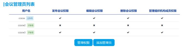 在會(huì)議管理員列表中,您可以查看會(huì)議管理員主賬號(hào)和子賬號(hào),主賬號(hào)可以添加子賬號(hào)并且對(duì)子賬號(hào)的進(jìn)行權(quán)限管理。