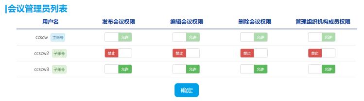 點(diǎn)擊【管理權(quán)限】按鈕后,主賬號(hào)可以對(duì)子賬號(hào)的發(fā)布會(huì)議權(quán)限、編輯會(huì)議權(quán)限、刪除會(huì)議權(quán)限和管理組織機(jī)構(gòu)成員權(quán)限進(jìn)行管理。修改后,點(diǎn)擊【確定】按鈕進(jìn)行保存。