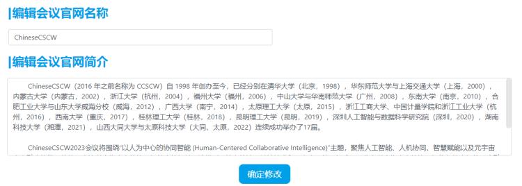 在會(huì)議官網(wǎng)名稱和會(huì)議官網(wǎng)簡(jiǎn)介中對(duì)相應(yīng)文本框進(jìn)行編輯,點(diǎn)擊【確定修改】按鈕,即可修改會(huì)議官網(wǎng)名稱和會(huì)議官網(wǎng)簡(jiǎn)介。