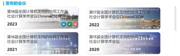 在發(fā)布的會(huì)議中,可以對(duì)同一域名下不同年份的會(huì)議進(jìn)行管理。將鼠標(biāo)懸停在想要進(jìn)行管理的年份會(huì)議卡片上,卡片右下方浮現(xiàn)的三個(gè)按鈕分別代表①瀏覽、②編輯和③刪除。