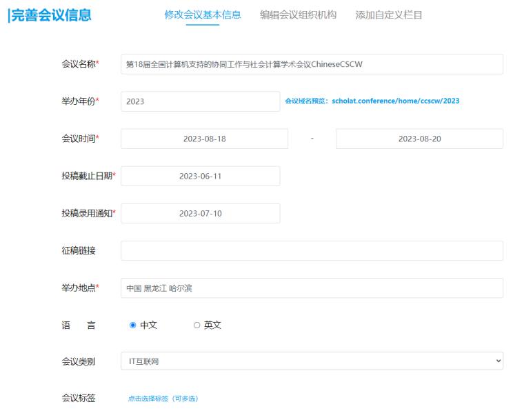 點(diǎn)擊綠色的【編輯】按鈕后,跳轉(zhuǎn)至完善會(huì)議信息頁面。在本頁面中,可以1)修改會(huì)議基本信息、2)編輯會(huì)議組織機(jī)構(gòu)和3)添加自定義欄目。