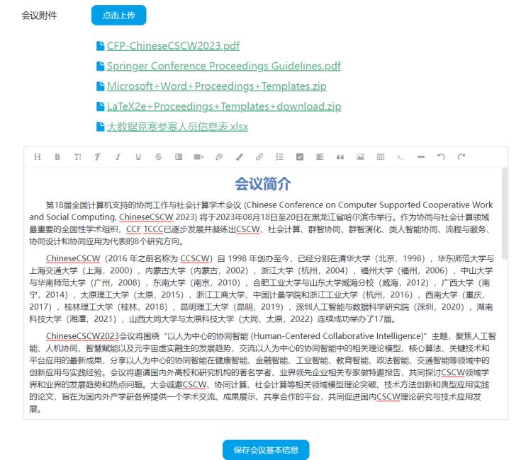 在本頁面中,可以修改會(huì)議基本信息(如會(huì)議名稱、舉辦年份、會(huì)議時(shí)間、投稿截止日期、投稿錄用通知、舉辦地點(diǎn)等),在底部點(diǎn)擊【保存會(huì)議基本信息】按鈕,即可保存。