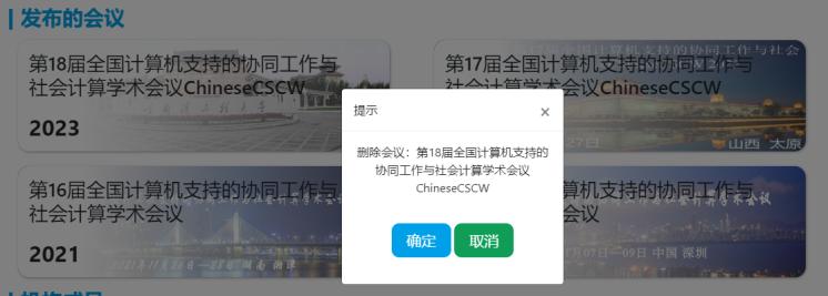 點(diǎn)擊紅色的【刪除】按鈕后,彈出確認(rèn)提示框,在提示框中點(diǎn)擊【確定】后,對(duì)應(yīng)年份的會(huì)議將被刪除。