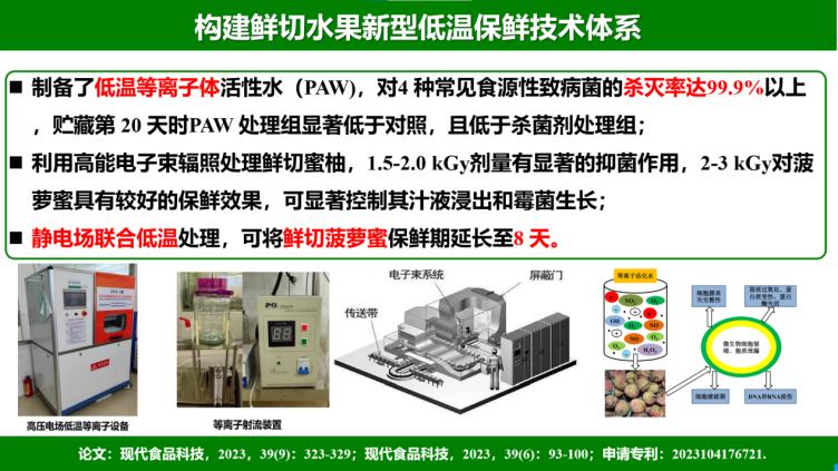 在水果保鮮方面,研發(fā)了適用于不同鮮切水果的新型包裝貯運(yùn)保鮮技術(shù),如建立了鮮切檸檬保鮮劑和氣調(diào)包裝處理技術(shù),4℃可貯藏4-6天,20℃可貯藏1-2天;采用自主研發(fā)的自發(fā)氣調(diào)袋包裝,可將鮮切菠蘿低溫貯藏期從6天延長(zhǎng)到9天等,有效延長(zhǎng)了水果的保鮮期,同時(shí)保持了水果的品質(zhì)和風(fēng)味;研發(fā)了一種納米生物抑菌劑,可將妃子笑荔枝常溫保鮮期延長(zhǎng)至5天,冷藏保鮮期延長(zhǎng)至35天以上。