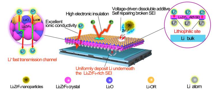 針對以上難點,研究團隊基于理論計算,驗證了以t-Li2ZrF6 晶體構(gòu)建理想型固態(tài)電解質(zhì)界面的可行性,首次提出用電場驅(qū)動m-Li2ZrF6 轉(zhuǎn)化為t-Li2ZrF6來構(gòu)筑固態(tài)電解質(zhì)界面的策略。相關(guān)實驗表明,這一策略不僅能夠憑借優(yōu)異的電子絕緣性阻止電子擊穿固態(tài)電解質(zhì)界面進而抑制電解液的分解,還能夠為Li+ 提供快速遷移的通道,提高鋰金屬電池的倍率性能。此外,t-Li2ZrF6晶體表面豐富的親鋰位點能夠和其內(nèi)部的離子通道一起,誘導(dǎo)鋰金屬均勻沉積,抑制鋰枝晶的生長,從而提高鋰金屬電池的安全性。同時,過量m-Li2ZrF6添加劑不僅能夠改善傳統(tǒng)添加劑在循環(huán)中被耗盡的缺陷,還能夠通過ZrF62-離子及時修復(fù)破損的固態(tài)電解質(zhì)界面,為鋰金屬負極的界面穩(wěn)定性提供長期保護。