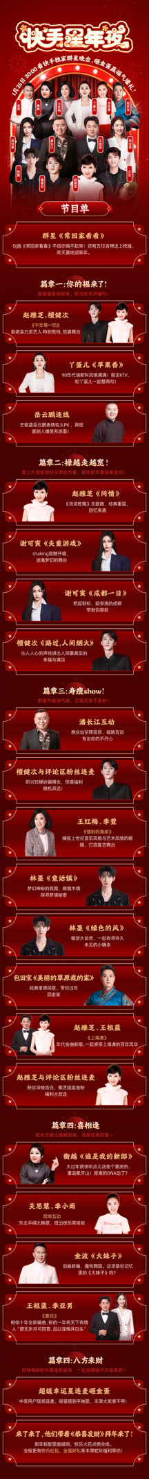 快手星年夜的晚會(huì)內(nèi)容被精心設(shè)計(jì)為五大篇章,每一章節(jié)分別由福祿壽、喜神和財(cái)神五位神仙角色開啟,爆款節(jié)目值得期待!檀健次和趙雅芝將攜手獻(xiàn)上經(jīng)典歌曲《千年等一回》,用歌聲帶你穿越時(shí)空,感受那份經(jīng)典的永恒之美;潘長江將以幽默詼諧的方式進(jìn)行唱跳表演,展現(xiàn)東北老鐵的獨(dú)有幽默;王祖藍(lán)和趙雅芝的經(jīng)典對(duì)唱《上海灘》,一波回憶殺讓人回味無窮;王祖藍(lán)與李亞男這對(duì)夫婦在結(jié)婚十周年之際,以特別方式合唱《愛你》,分享他們的甜蜜時(shí)刻,傳遞愛與溫馨……每個(gè)篇章不僅有精彩的表演,還穿插了豐富的福利互動(dòng)環(huán)節(jié),讓觀眾們能深度參與到這場(chǎng)盛大的狂歡中。
