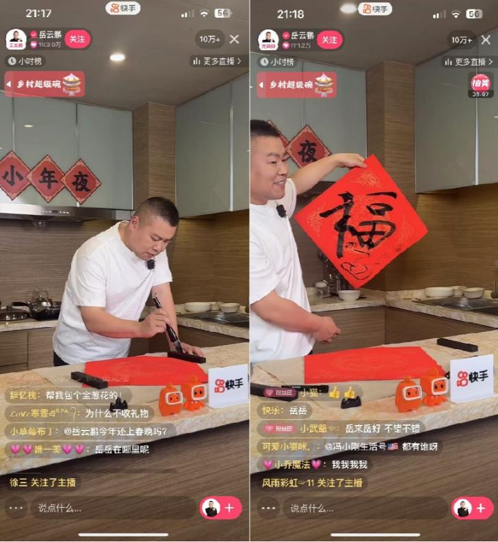 直播接近尾聲時(shí),直播間由鍋碗瓢盆轉(zhuǎn)到了文房四寶,岳云鵬現(xiàn)場(chǎng)寫福字并添加蛇年新春元素。他揮毫潑墨,一氣呵成,將寫好的福字簽名送給快手老鐵們。最后,岳云鵬以一首《快樂中國年》為直播畫上了圓滿的句號(hào),他深情地送上了新年祝福,希望每一位老鐵都能在新的一年里快樂幸福、健康平安。